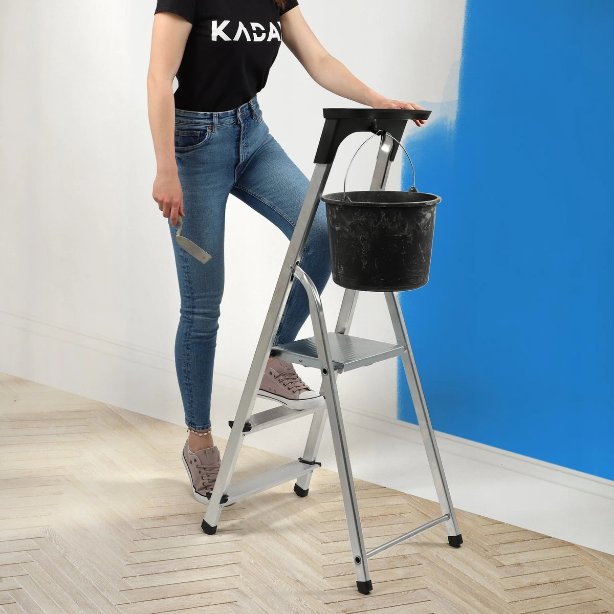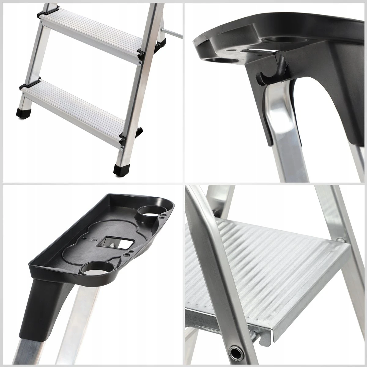 Narz臋dzie wykonane jest z trwa艂ego i lekkiego aluminium, dlatego nie b臋dziesz mie膰 problem贸w z zabieraniem go w podr贸偶. Nasza drabina aluminiowa dzi臋ki kompaktowym rozmiarom 艂atwo zmie艣ci si臋 w baga偶niku samochodowym, gara偶u lub schowku na narz臋dzia.