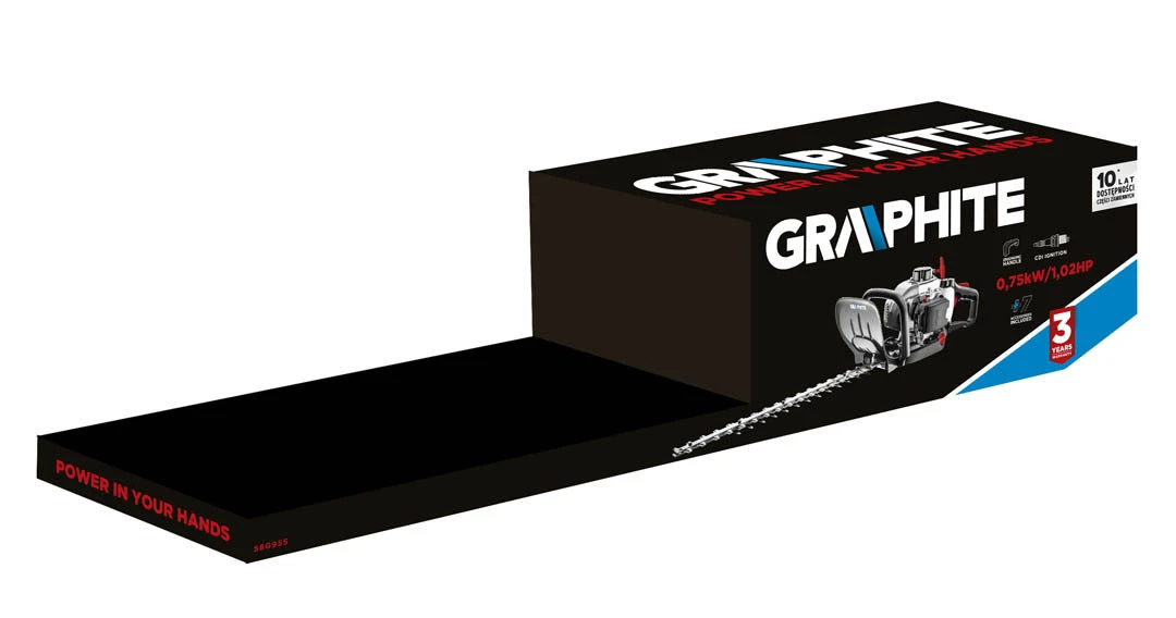 Wysokiej klasy nożyce spalinowe do żywopłotu marki GRAPHITE z wydajnym silnikiem o mocy 0.75 kW (1.02 KM), przeznaczone do przycinania i podcinania żywopłotów, krzewów oraz cienkich gałęzi.