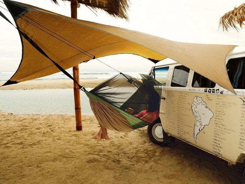- aby wejść do środka należy otworzyć podwójny zamek błyskawiczny z boku hamaka