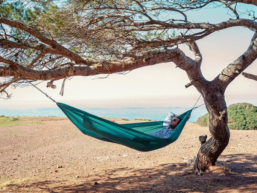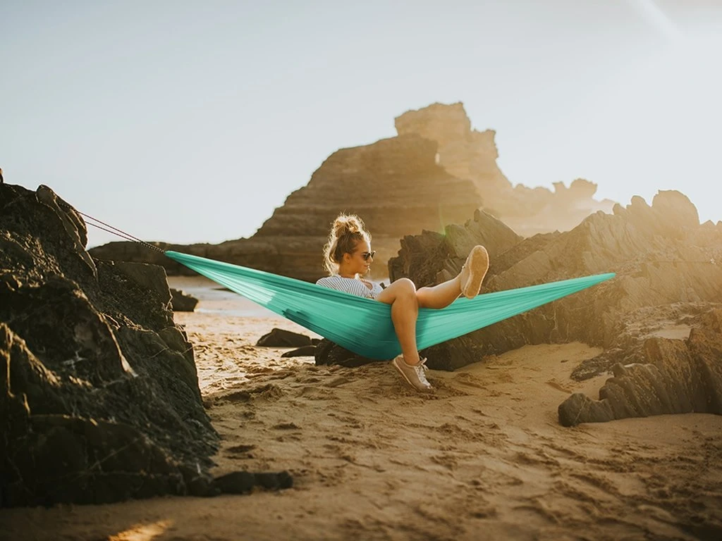 - wygodne rozwiązanie all-in-one – wystarczy przywiązać hamak z każdej strony do drzewa i umocować za pomocą haka