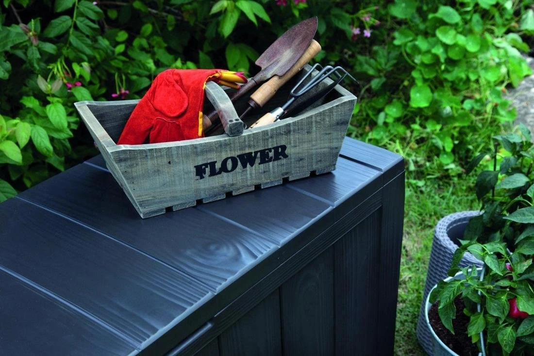Schowek znajdzie zastosowanie na wielu polach: może służyć do przechowywania narzędzi ogrodowych, dzięki czemu sekatory, nożyce czy konewkę będziesz mieć cały czas pod ręką, bez szukania ich na półkach w garażu. Skrzynia sprawdzi się także jako miejsce w którym schowasz poduszki i koce na wieczornego grilla. Kiedy minie lato nasz produkt wykorzystasz we wnętrzach: dzięki niemu w pokojach dziecięcych zapanuje idealny porządek, bo w pojemniku swoje miejsce odnajdą zabawki i gadżety pociech. Skrzyni użyjesz także w garażu i piwnicy – zmieścisz w niej narzędzia czy sprzęt warsztatowy o łącznej wadze 20 kg.