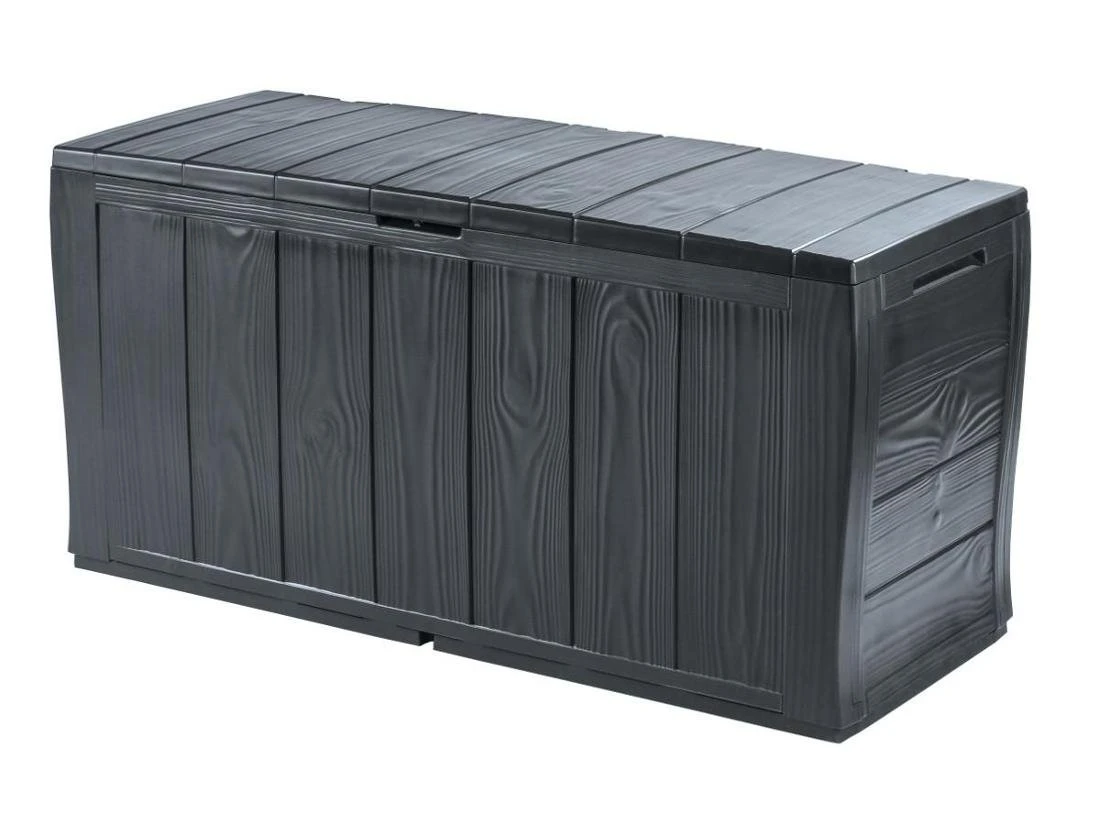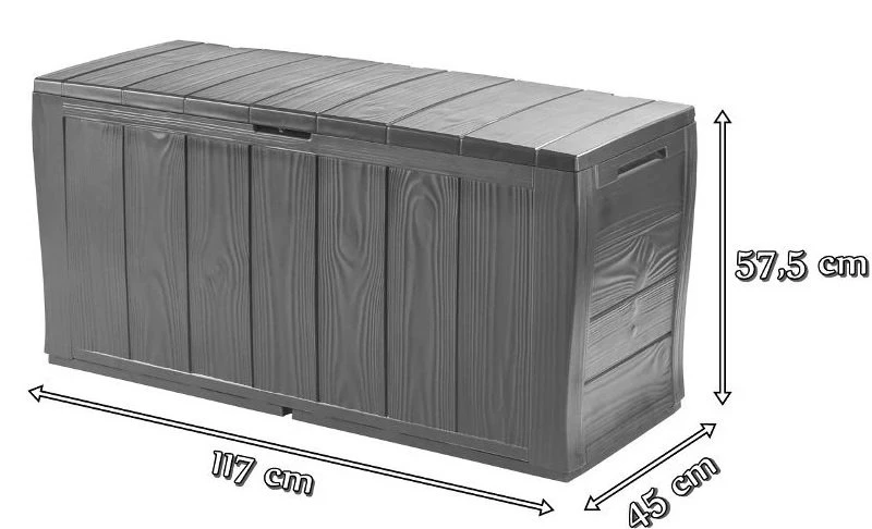 Dzięki fakturze drewna skrzynia ogrodowa idealnie wkomponuje się w każdą przestrzeń, dopełniając aranżacji w domu oraz uzupełniając architekturę ogrodową. Klasyczna, modna kolorystyka nie znudzi Ci się z upływem czasu, a minimalistyczna bryła skrzyni oraz jej kompaktowe wymiary sprawią, że bez problemu zaaranżujesz z nią dowolne miejsce w domu i ogrodzie! Swobodne transportowanie skrzyni umożliwią wygodne uchwyty oraz kółka. Skrzynię otworzysz się bez żadnego oporu dzięki pokrywie, którą możesz dodatkowo zabezpieczyć za pomocą kłódki (nie jest dołączona w zestawie).