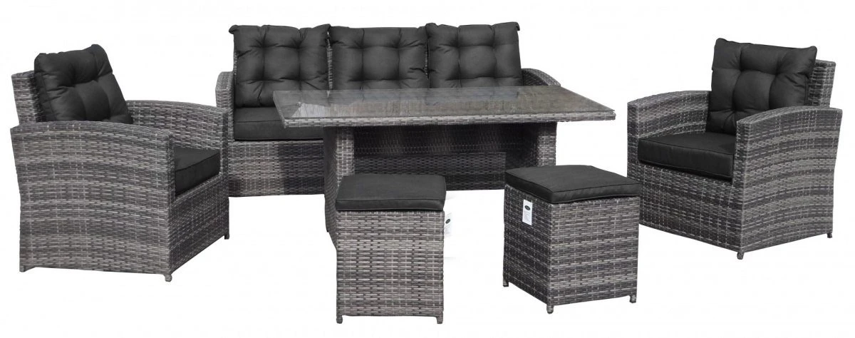 | Opis | Aluminiowy komplet mebli z technorattanu – zestaw sofa z wysokim stołem + 2 fotele + 2 pufy + 12 poduszek, szary [201011-B] |
