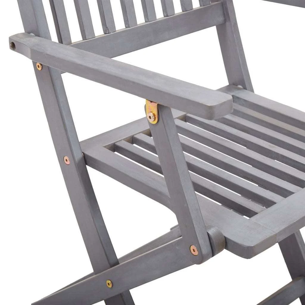 Nowoczesny zestaw drewnianych krzeseł stołowych doda odrobinę stylu Twojemu ogrodowi lub tarasowi. Te składane krzesła będą świetnym wyborem, jeśli planujesz posiłki na świeżym powietrzu. Meble wykonano z najlepszej jakości drewna akacjowego – twardego drewna tropikalnego, które jest odporne na warunki atmosferyczne i bardzo trwałe. Poszarzana powierzchnia jest łatwa do czyszczenia wilgotną ściereczką. Krzesła można złożyć, gdy nie są w użyciu, aby zaoszczędzić miejsce. Meble są łatwe w montażu. W skład przesyłki wchodzą 4 składane krzesła.