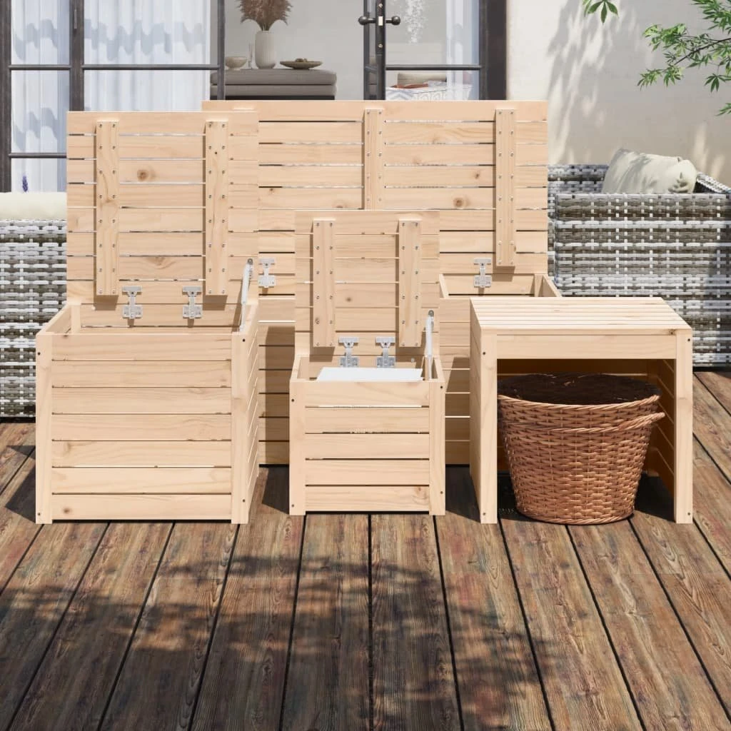 Zestaw drewnianych skrzyń ogrodowych zapewni Ci mnóstwo miejsca do przechowywania narzędzi i innych przyborów. Lite drewno sosnowe: drewno to piękny, naturalny materiał. Drewno sosnowe ma prostą strukturę słojów, a sęki nadają mu wyjątkowy, rustykalny wygląd. Meble ogrodowe wykonano z litego drewna sosnowego, dzięki czemu są solidne i stabilne.Dużo miejsca: skrzynie zapewnią sporą przestrzeń do przechowywania i uporządkowania poduszek, zabawek dziecięcych, narzędzi ogrodowych i innych akcesoriów.Praktyczna pokrywa: meble zewnętrzne są wyposażone w pokrywy, które nie tylko zapobiegają zakurzeniu przedmiotów, ale także zwiększają ich bezpieczeństwo.Uniwersalność: skrzynie ogrodowe mogą służyć nie tylko do przechowywania, ale także jako siedziska lub stoliki na zewnątrz. Uwaga:Aby utrzymać meble ogrodowe w dobrej kondycji, zalecamy zabezpieczenie ich wodoodpornym pokrowcem.