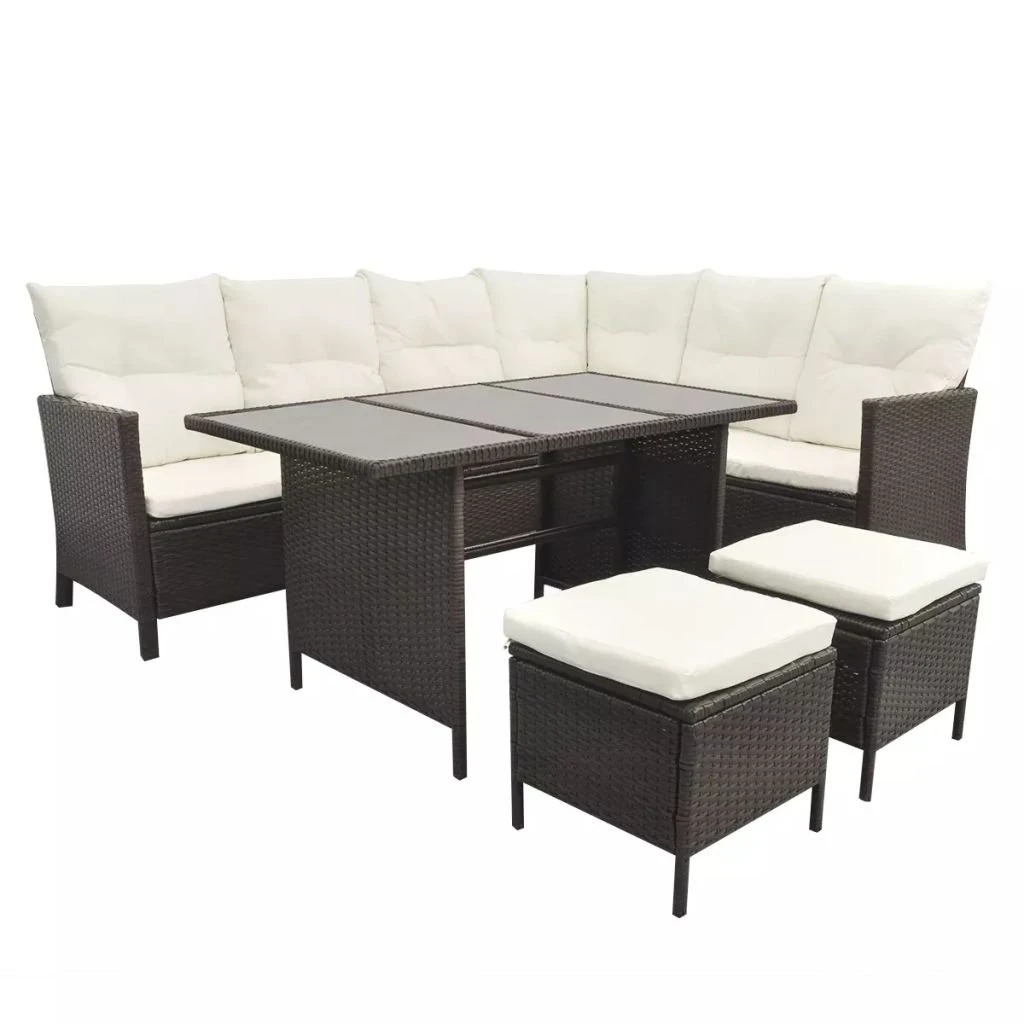 Nasz zestaw eleganckich, komfortowych mebli rattanowych stanie się prawdziwą atrakcją Twojego ogrodu lub tarasu. W jego skład wchodzi również stół jadalniany i miękkie poduszki, co czyni go idealnym kompletem mebli do serwowania posiłków na świeżym powietrzu lub po prostu relaksu i czerpania radości z dobrej pogody. Dzięki odpornemu na warunki pogodowe i wodę rattanowi PE zestaw wypoczynkowy jest łatwy do czyszczenia, wytrzymały i odpowiedni do użytku na zewnątrz. Meble mają mocną, malowaną proszkowo, stalową ramę, dzięki czemu są niezwykle trwałe. Blat ze szkła hartowanego jest mocny i łatwy do czyszczenia. W skład zestawu wchodzą także komfortowe poduszki. Poliestrowe poszewki mają zapięcia na suwak, dzięki czemu można je zdjąć i wyprać. Rattanowy komplet jest niezwykle lekki, co umożliwia jego swobodne przestawianie, by wkomponować idealnie w otoczenie. Przesyłka zawiera: 1 sofę w kształcie litery L, 1 stół, pufy, 7 poduszek na oparcia i 5 na siedziska. Uwaga: zalecamy przykrycie zestawu na czas deszczu, śniegu i mrozu.