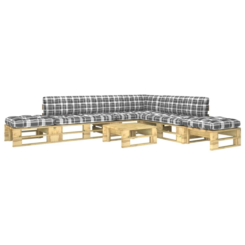 Ten ogrodowy zestaw mebli wypoczynkowych z drewnianych palet stanowi znakomity wybór, aby się zrelaksować i nacieszyć dobrą pogodą albo zdrzemnąć lub porozmawiać z rodziną lub przyjaciółmi. Za sprawą ponadczasowej konstrukcji z palet ten ogrodowy komplet wniesie odrobinę rustykalnego uroku na Twoje patio, do ogrodu lub do salonu. Wykonany z impregnowanego drewna sosnowego zestaw mebli ogrodowych jest trwały i odporny na czynniki atmosferyczne. Charakteryzuje się solidną konstrukcją i łatwością utrzymania. Wraz z dołączonymi poduszkami zapewni najwyższy komfort Tobie i Twoim gościom. Uwaga: aby przedłużyć żywotność mebli ogrodowych, zalecamy zabezpieczenie ich wodoodpornym pokrowcem.