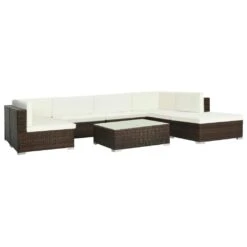 Polirattanowy zestaw wypoczynkowy, składający się z 2 sof narożnych, 4 sof środkowych, 1 stolika kawowego, 1 pufa, 8 poduszek na oparcia i 7 poduszek na siedziska, stworzy stylowe miejsce do siedzenia na tarasie lub w ogrodzie. Dzięki odpornemu na czynniki pogodowe rattanowi PE zestaw wypoczynkowy jest łatwy w czyszczeniu, wytrzymały i odpowiedni do codziennego użytkowania na zewnątrz. Malowane proszkowo, stalowe ramy zapewniają stabilność i trwałość. Komplet jest lekki, a jego modułowe części można ustawiać w różnych konfiguracjach. Dostarczany jest wraz z bardzo wygodnymi, grubo wyściełanymi poduszkami na siedziska i oparcia, zapewniającymi najwyższy komfort. Ich łatwe w utrzymaniu, poliestrowe powłoczki można zdjąć i wyprać. Zestaw wymaga montażu. Uwaga: na czas deszczu, śniegu lub mrozu zalecamy przykryć meble, aby zapewnić ich dłuższą trwałość.
