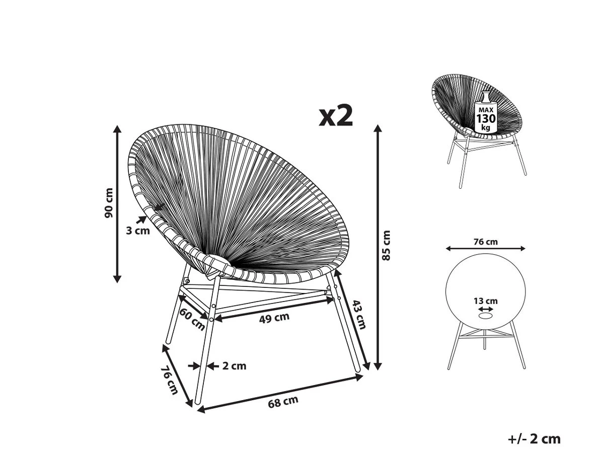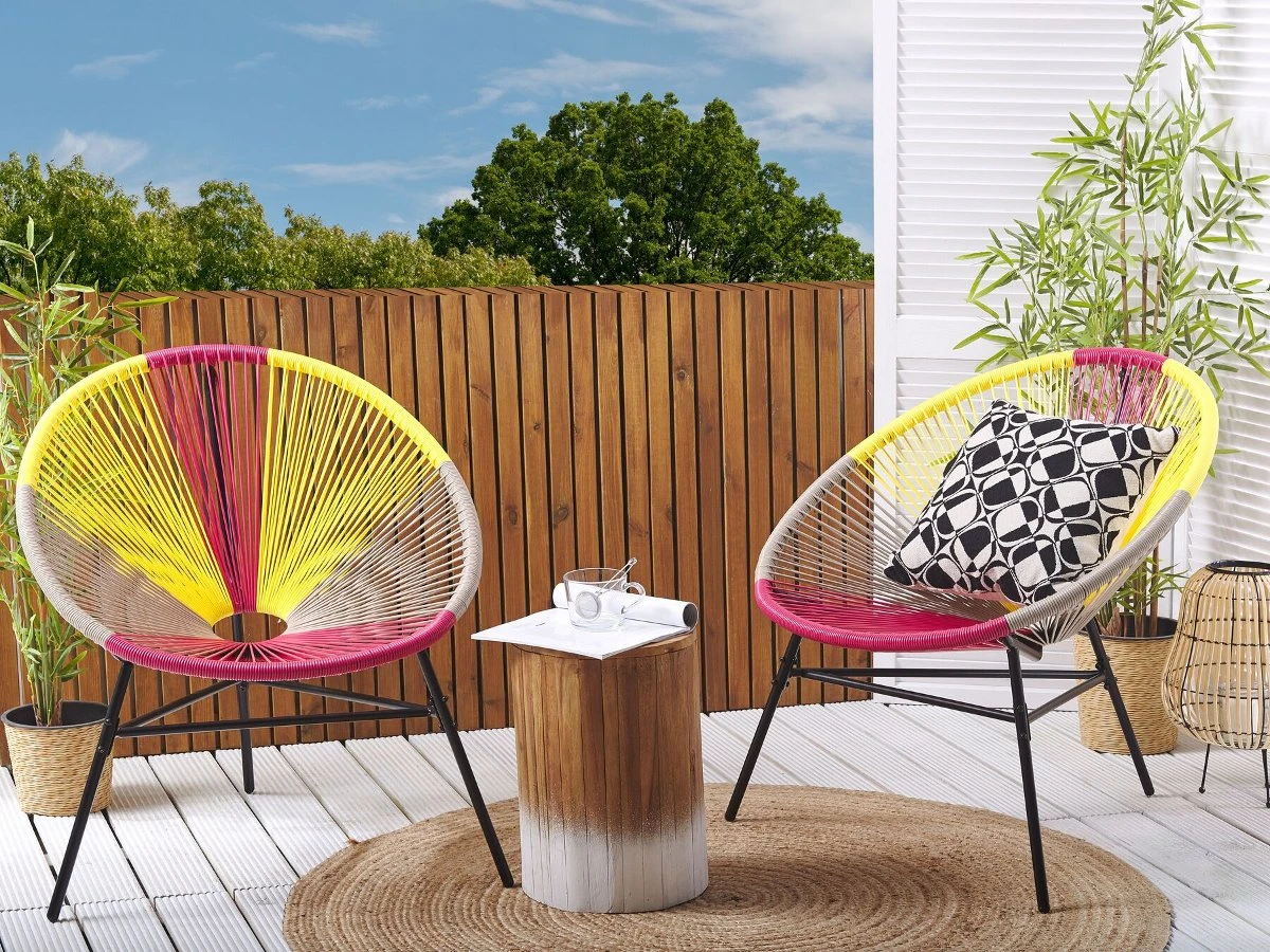 Komplet krzeseł typu spaghetti z syntetycznego rattanu . Ten zestaw dwóch krzeseł inspirowany stylem meksykańskim to wspaniały dodatek do każdej aranżacji w stylu nowoczesnym lub industrialnym. Ich obszerne, okrągłe siedziska wykonane są z wytrzymałego, syntetycznego rattanu, który wspaniale komponuje się z czarną, metalową ramą. Niezwykle wygodne, a zarazem nadzwyczaj wytrzymałe, krzesła sprawdzą się również na tarasie czy w ogrodzie.