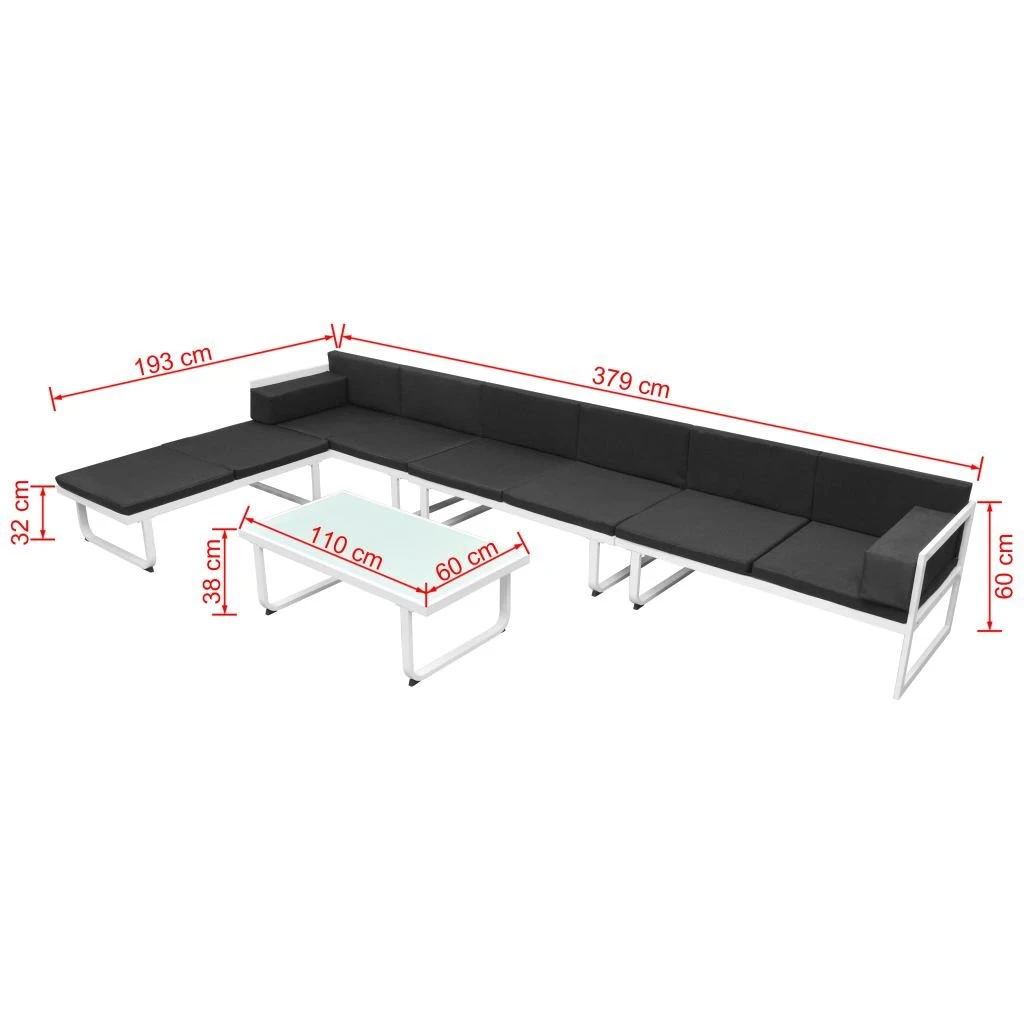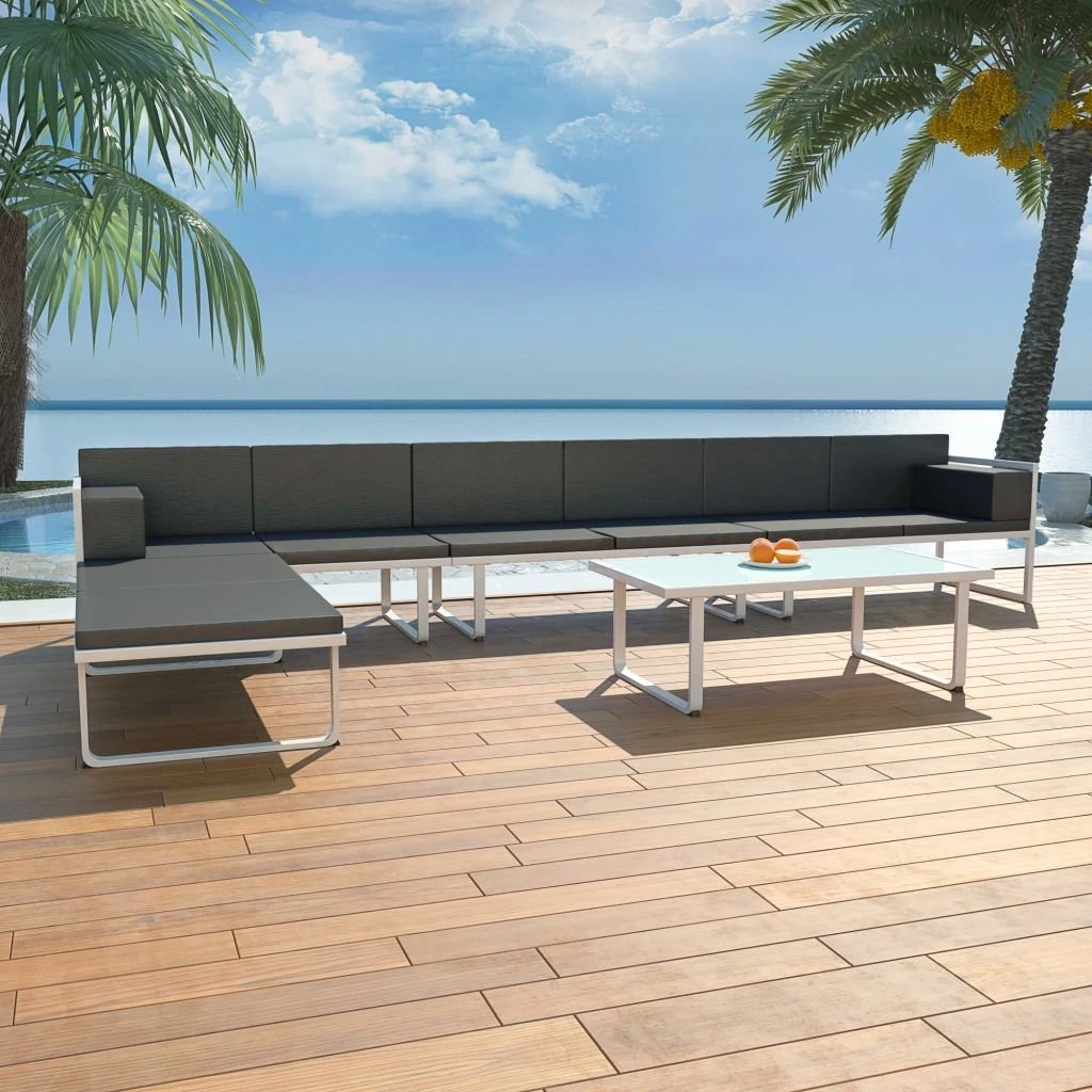 Zestaw mebli wypoczynkowych wykonanych z najwyższej jakości materiałów łączy w sobie styl i funkcjonalność. Stanie się głównym punktem w Twoim ogrodzie lub na tarasie. Zestaw zaprojektowano tak, by można było z niego korzystać przez cały rok na zewnątrz. Dzięki ramie ze 100% aluminium, komplet ten jest łatwy w czyszczeniu, wytrzymały oraz odpowiedni do codziennego użytku. Siedziska wykonano z tkaniny textilene, która jest bardzo komfortowa oraz odporna na warunki pogodowe. Grube, zdejmowane poduszki siedziska, oparcia i podłokietników są wygodne i nadają się do pranie w pralce. Przesyłka zawiera: 2 sofy dwuosobowe (prawa i lewa), 1 sofę bez podłokietników, 1 otomanę, 1 stolik kawowy z 5-milimetrowym, szklanym blatem, 4 poduszki na siedziska, 6 poduszek pod plecy i 2 poduszki na podłokietniki. Uwaga: Zalecamy przykrycie zestawu na czas opadów deszczu, śniegu i mrozu.