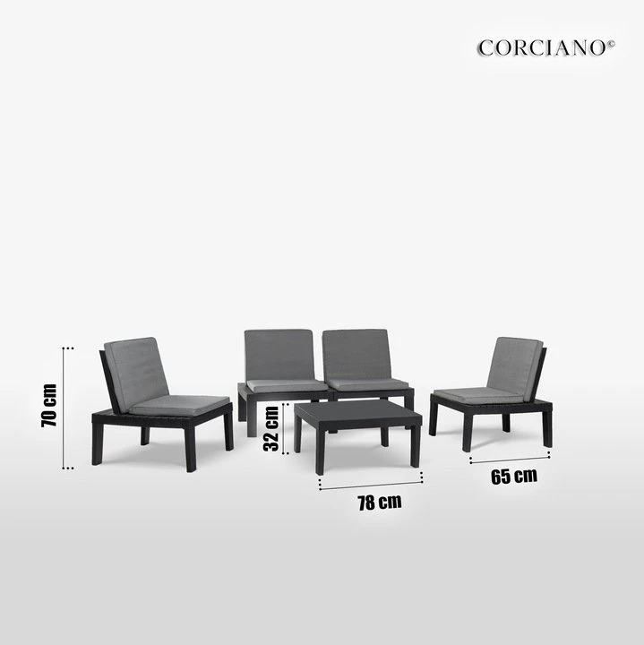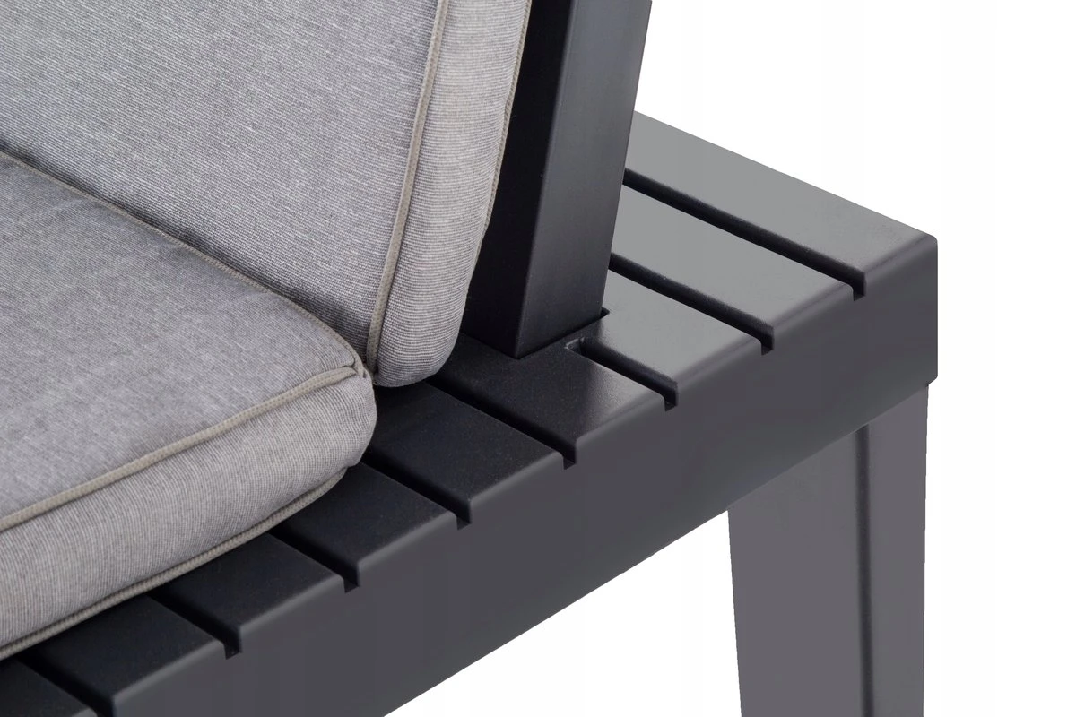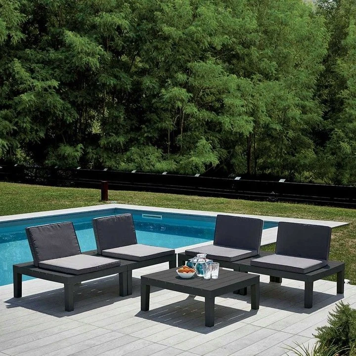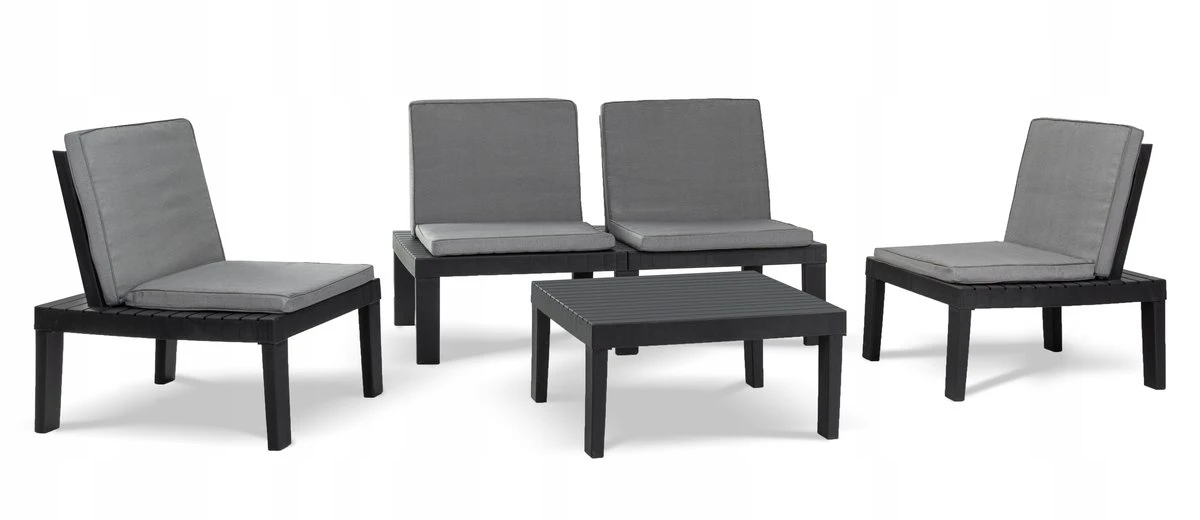 Bogaty komplet mebli ogrodowych składa się ze stolika kawowego, 4 modułowych foteli o kolorze antracytowym.