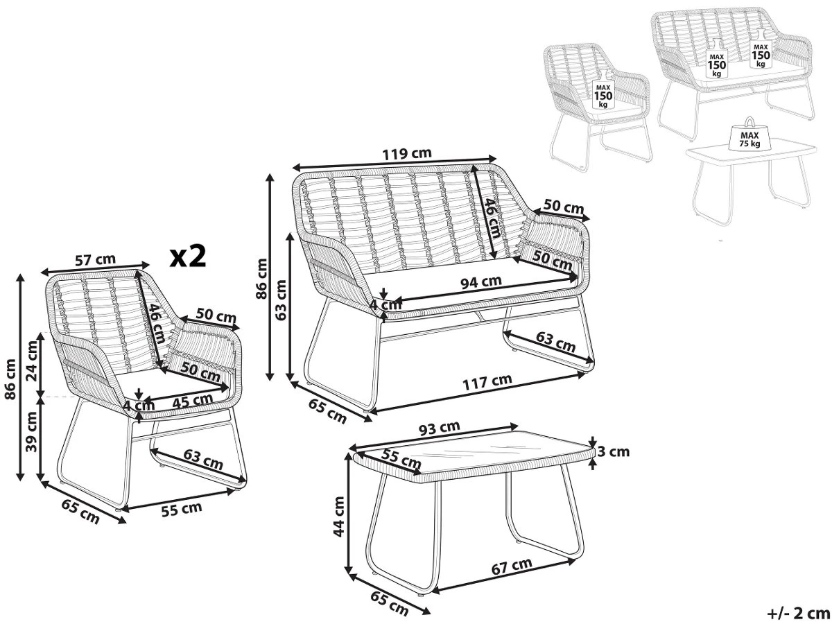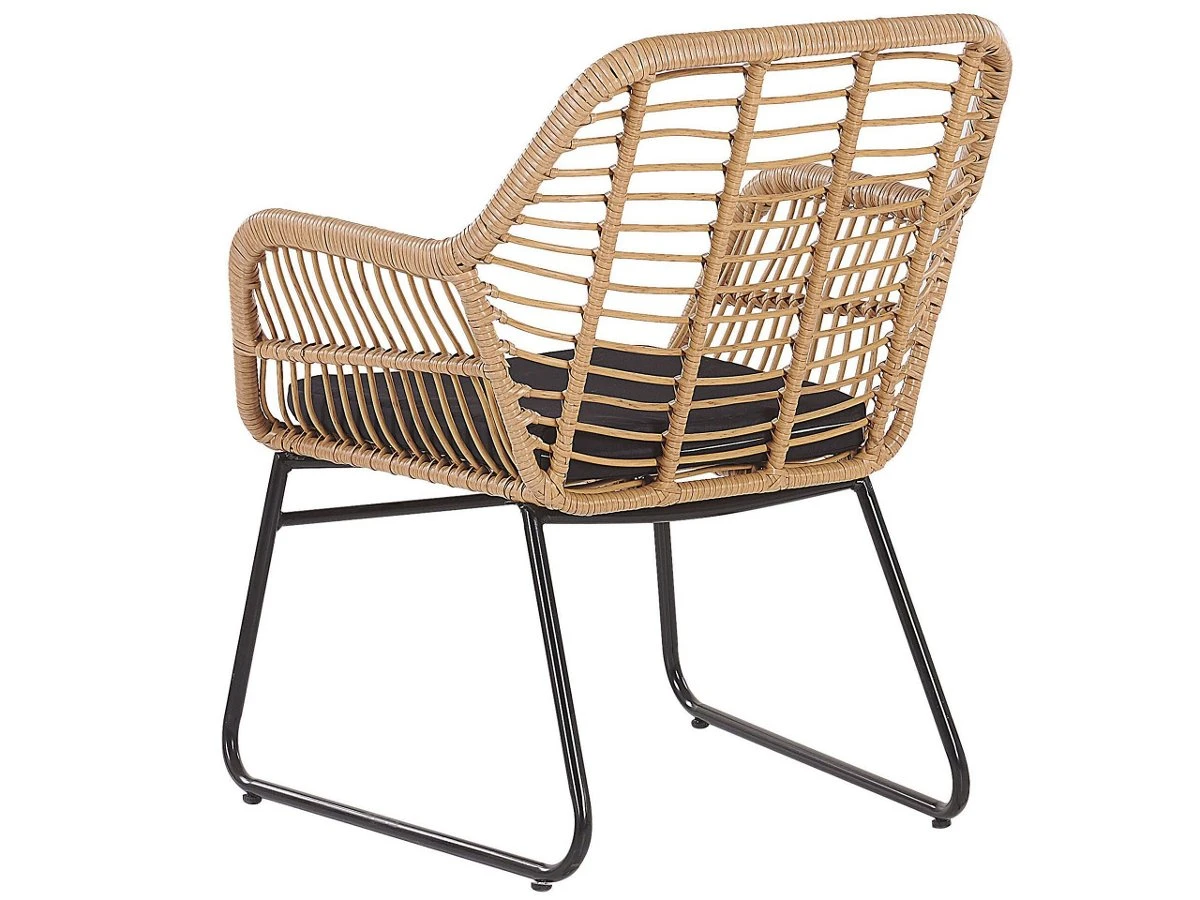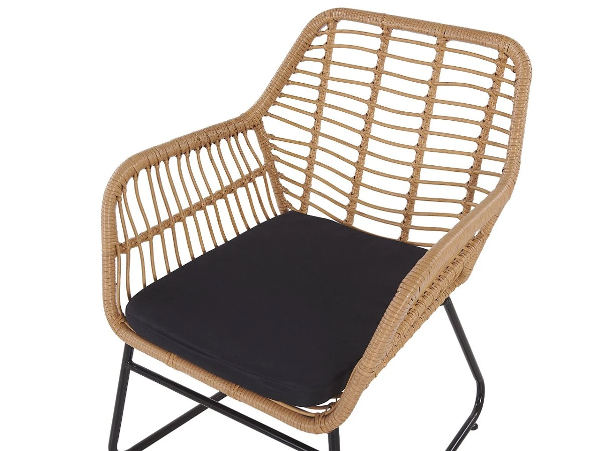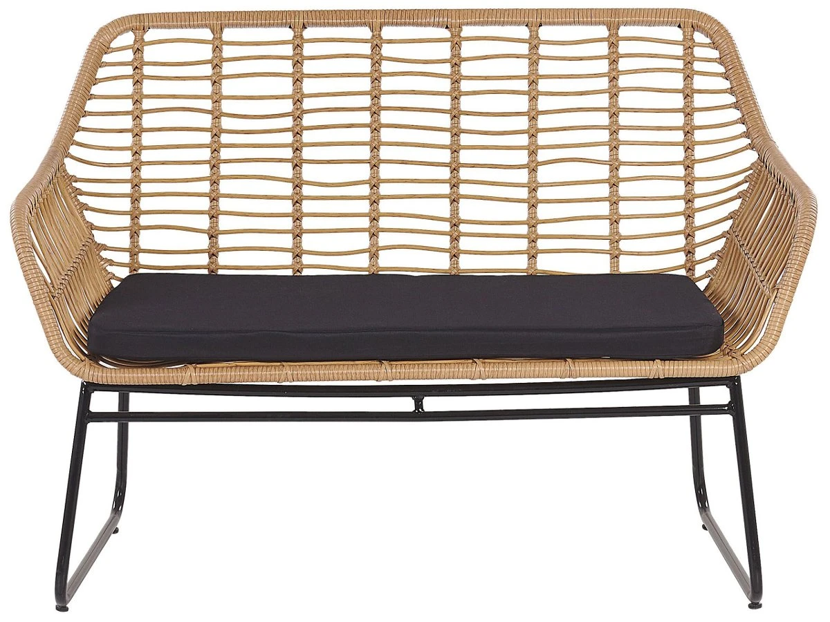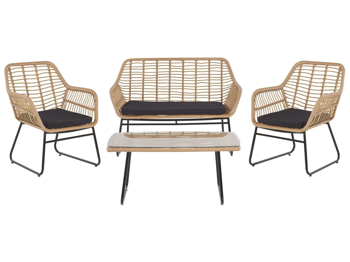 Rattanowy zestaw mebli ogrodowych z czarnymi poduszkami. Czerp większą przyjemność z pobytu na świeżym powietrzu, poprzez dodanie do swojego ogrodu wygodnego zestawu. Ławka i dwa fotele zapewniają miejsce dla 4 osób, a stolik kawowy umożliwia częstowanie się przekąskami i napojami podczas relaksu. Miękkie poduszki siedzeniowe podnoszą poziom komfortu.